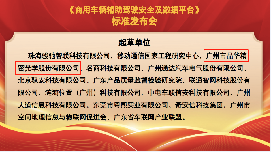 2022年12月30日下午,由廣州市晶華精密光學股份有限公司作為主要起草單位的《商用車輛輔助駕駛安全及數(shù)據(jù)平臺》團體標準正式發(fā)布,晶華光學主要起草人:宋鑫、胡文祥。